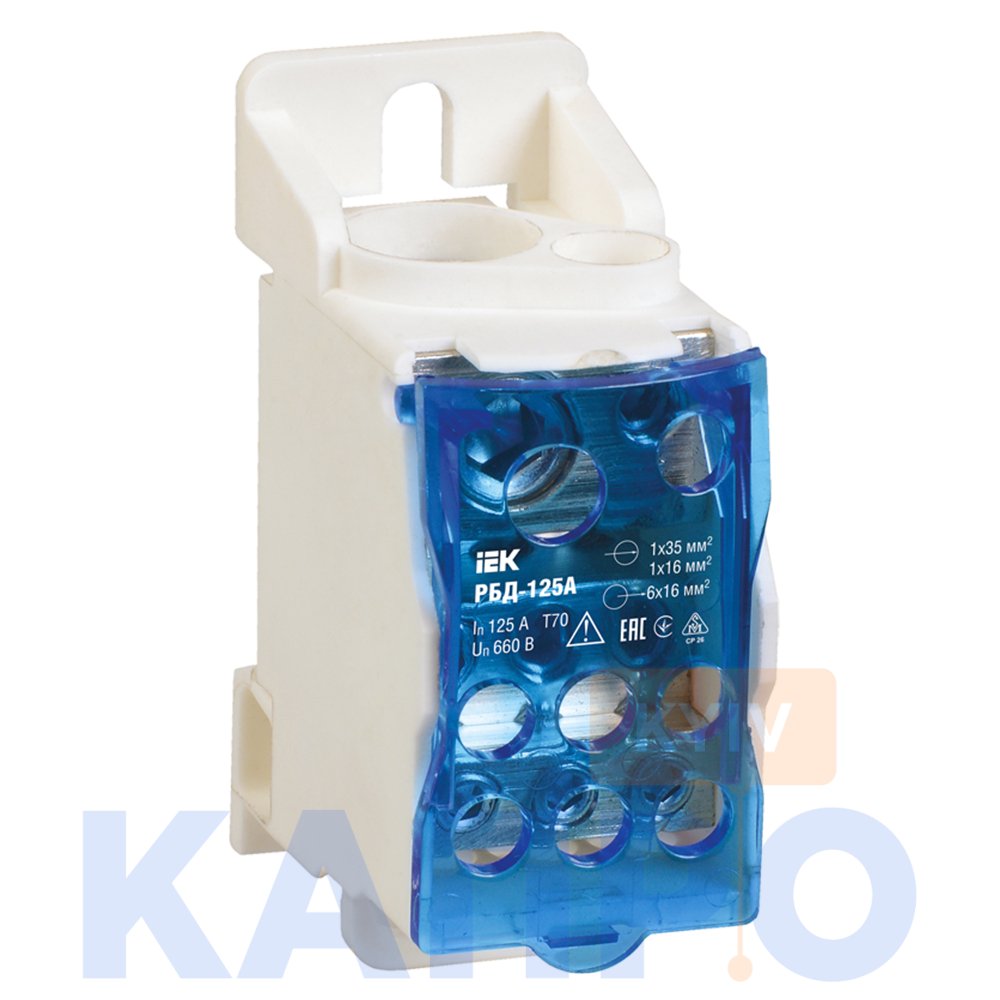 Розподільчий блок РБД-125 від iEK призначений для використання в якості клемного затиску при підключенні до провідника більшого перетину декількох провідників меншого перетину, для створення впорядкованих систем розподілу в шафах, для організації головної заземлювальної шини. Монтується на DIN-рейку або монтажну панель в силових шафах або у квартирних розподільних щитах.