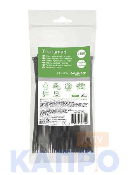 Кабельні хомути Thorsman виготовлені з УФ стійкого чорного поліаміду, що застосовуються як в приміщенні, так і на вулиці, а з білого поліаміду – лише у приміщеннях.