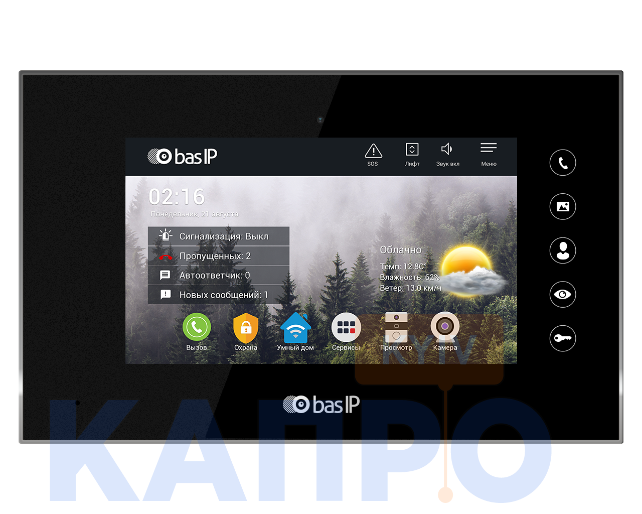 - Функції: Автовідповідач, Сценарії, Підключення дод.відеокамери, Підключення дод.панелі, Підключення дод.моніторів, Підключення датчиків сигналізації, Можливість установки сторонніх додатків, Режим «фоторамка»