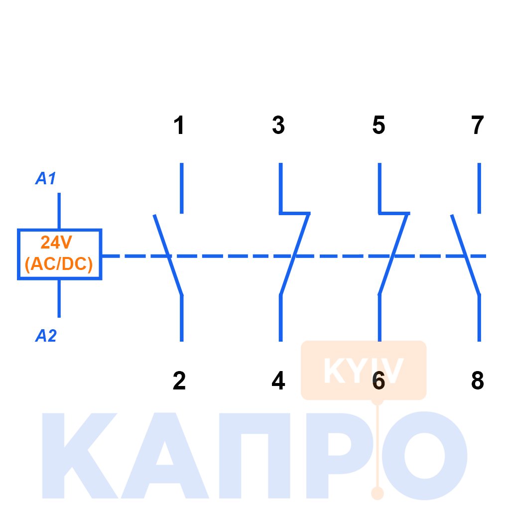 – Кількість і положення силових контактів: 2 НВ + 2 НЗ (2 Нормально відкриті + 2 Нормально закриті).