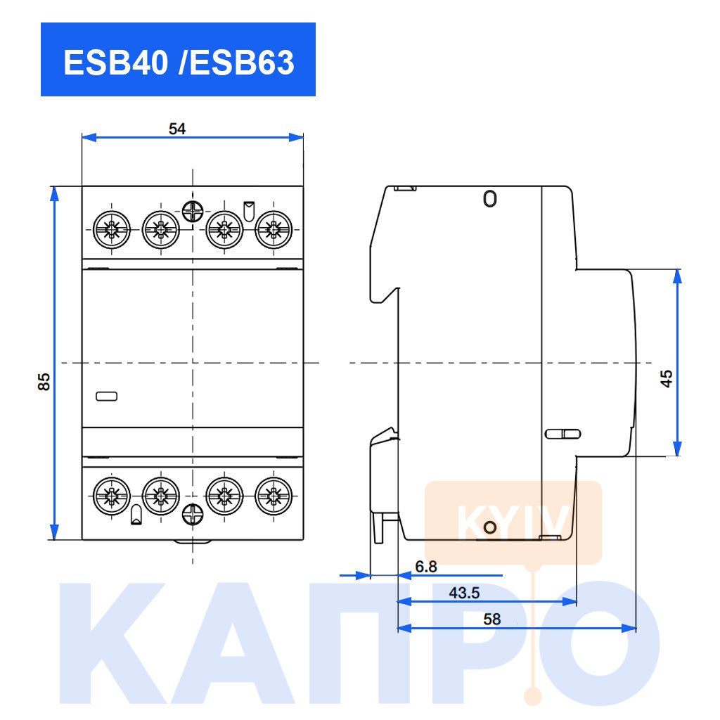 Установчий контактор ESB40-22N-01 використовуються для управління однофазними і трифазними навантаженнями до 40 А і може працювати від змінної або постійної напруги.