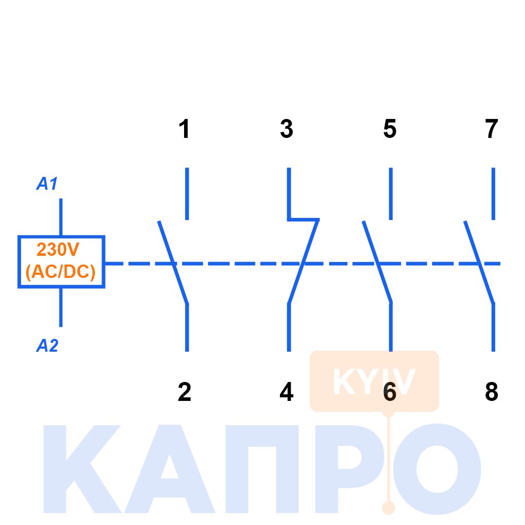 – Кількість і положення силових контактів: 3 НВ + 2 НЗ (3 Нормально відкриті + 1 Нормально закриті).