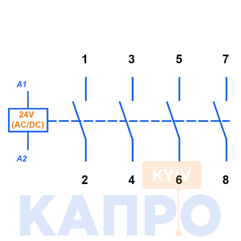 – Кількість і положення силових контактів: 4 НВ (нормально відкриті).