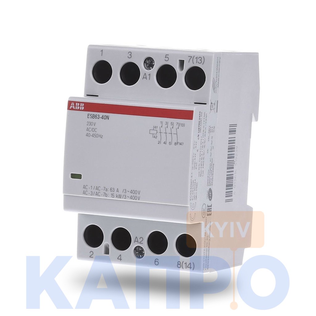 Установчий контактор ESB63-40N-06 використовуються для управління однофазними і трифазними навантаженнями до 63 А і може працювати від змінної або постійної напруги.