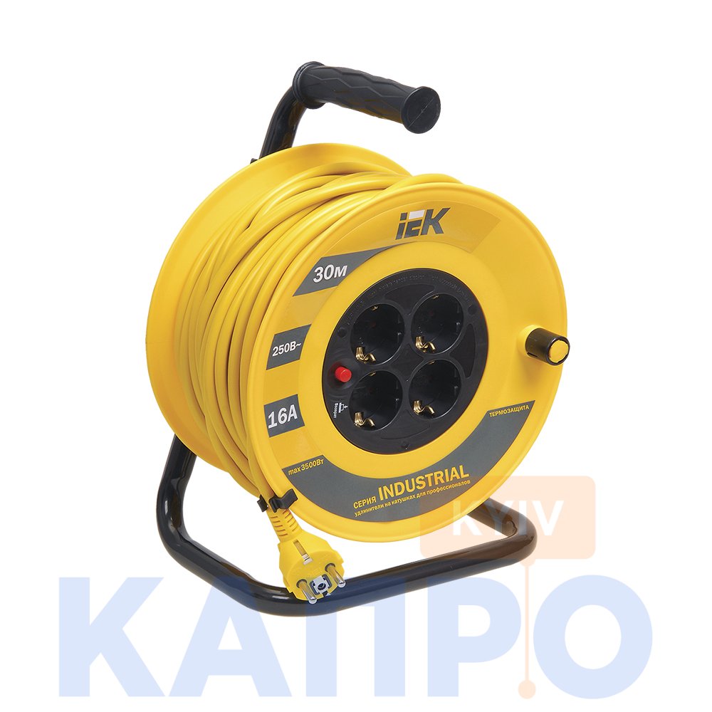 Подовжувач на котушці УК 30 IEK серії Industrial, призначений для віддаленого підключення стаціонарного обладнання. Виріб незамінний на будівельних майданчиках, на садових ділянках і в будь-якому іншому виді промисловості.