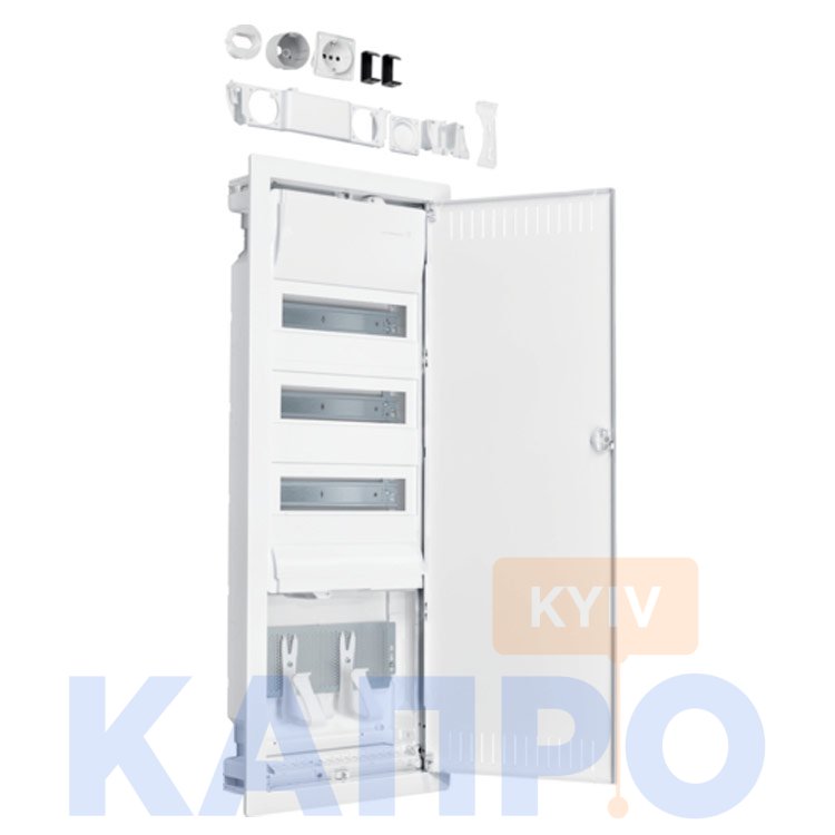– Комплектація: дин-рейки, фальш панель, перфорована дверцята, розетка, тримач для медіа пристроїв і перфорованими панелями.